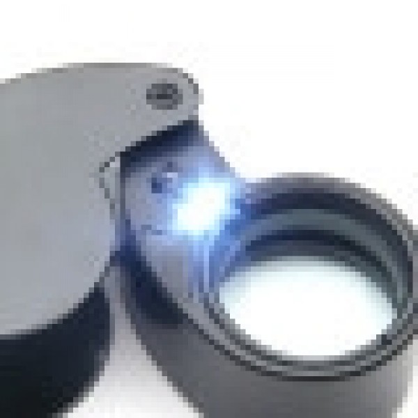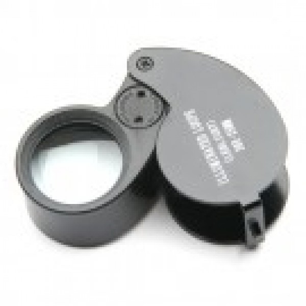 25 mm Glass Lens A powerful lighted magnifier at a very low cost. Equipped with a tiny, though very bright, LED lamp (battery included). Extra large magnifying glass lens is 25 mm (1 inch) in diameter incorporated in a plastic, folding case with a matte black finish. Measures 2-1/4" long when folded. Furnished with a fitted plastic storage case with a clear cover. Made in China.