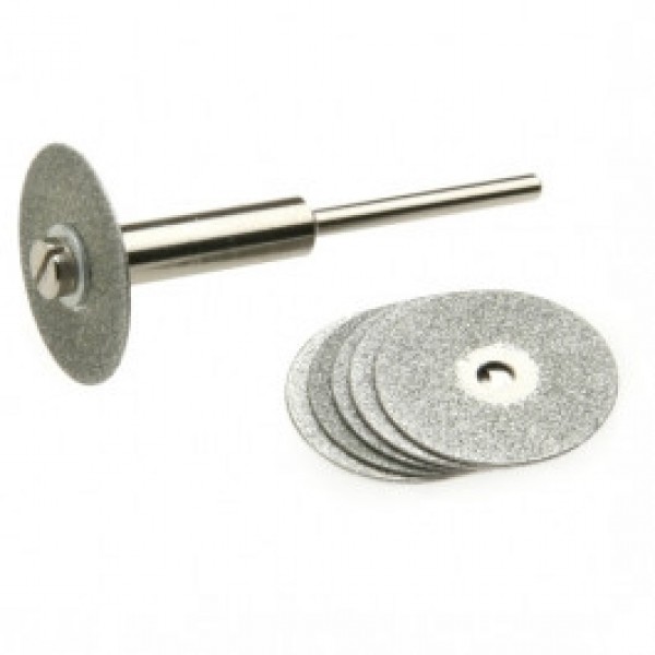 For cutting, carving, sawing, and shaping all metals as well as ceramics, all woods, porcelain, marble, glass, etc. Coated on both sides with galvanically bonded, 120 grit diamond particles. Mandrels have a reinforced shoulder and 1/8" dia. screw. Standard 3/32" diameter shanks fit the adjustable chucks found on most flexshaft handpieces as well as 3/32" handpiece collets.
