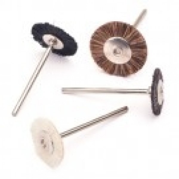 Mounted brushes for cleaning hard-to-reach areas and for general cleaning and polishing. Each brush has a single row of natural bristles secured in a steel hub fastened to a standard 3/32" diameter shank. Available in stiff, medium, soft, and extra soft, and in 3 diameters. Maximum speed 25,000 RPM. Sold by the piece.