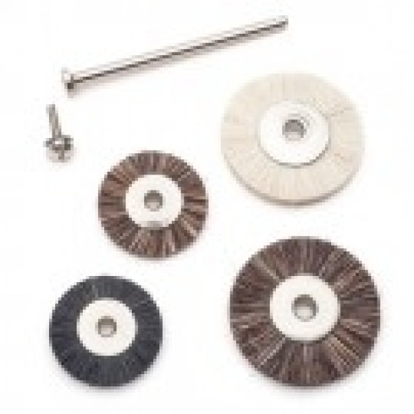 Unmounted brushes for cleaning hard-to-reach areas and for general cleaning and polishing. Each brush has a single row of natural bristles secured in a steel hub with a 3/32" or 1/8" hole for mounting onto a miniature mandrel. Available in stiff, medium, and extra soft, and in 2 diameters. Maximum speed 25,000 RPM. Brushes with 3/32" holes should be used with mandrels having 1/16" dia. screws. Brushes with 1/8" holes should be used with mandrels having 1/8" dia. screws. Sold by the piece.