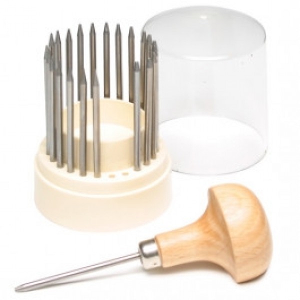 Assortments of the tools listed above, one set has 12 tools and the other has all 23 tools. Each set is provided with a handle and a plastic stand. Made in Switzerland.